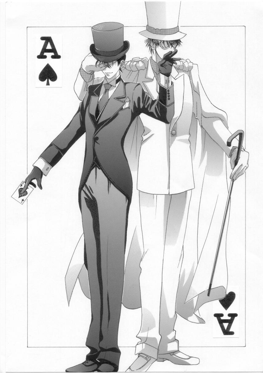 互いのことをよく知らない二人・・・というイメージですね。本来キッドが持つ筈のカードを新一が、英国風ファッションの新一が